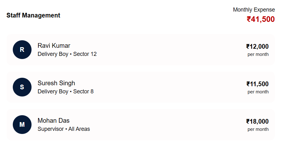Manage delivery staff profiles, calculate salaries, and track monthly expenses.